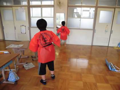 エイサーのはっぴに文字が入り,やる気が一気に上昇しています。全体練習に参加し,教室でおさらいしています。赤いはっぴがとてもよく似合っています。