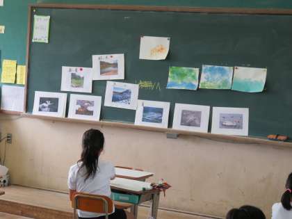 というお話をもとに想像を広げて絵に表していきます。「ぬたくり」という手を使って塗る技法などを使って,背景づくりをしました。