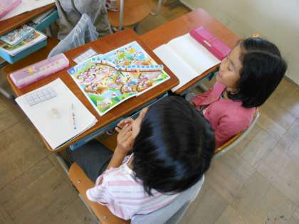 算数科で「かけ算」の学習がはじまりました。今日は数図ブロックを使い,乗り物にのっている人の数を数えました。かけ算の基礎になる□この○つ分という考え方を知りました。