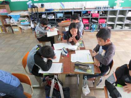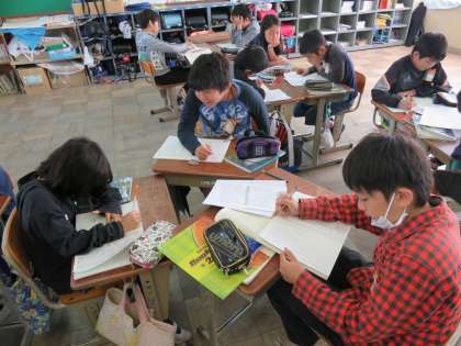 国語科の学習で,よりよい社会を実現するための提案書を書く学習をしています。今日は,調べてきた情報をもとに班でどのような内容を書くのか話し合いをしました。