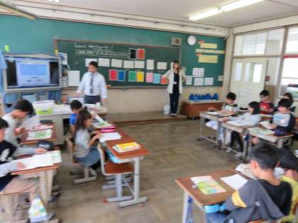 今日はALTのマルタ先生にも来ていただいて,日本語と英語の色や形の言い方のちがいについて学習しました。