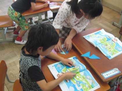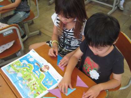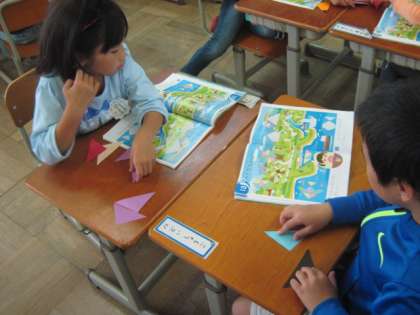 三角形の折り紙を使って、教科書に描かれた形をつくりました。