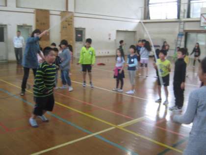 今日は、体育館でボール送りゲームと大縄跳びをしました。