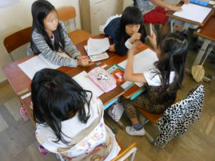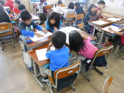 国語科では「お話のさくしゃになろう」を学習しています。グループで一つのお話を作り,それを1年生に読み聞かせしようと計画しています。まずは自分で考えたお話を持ちより,一つのお話を構成する活動をしました。