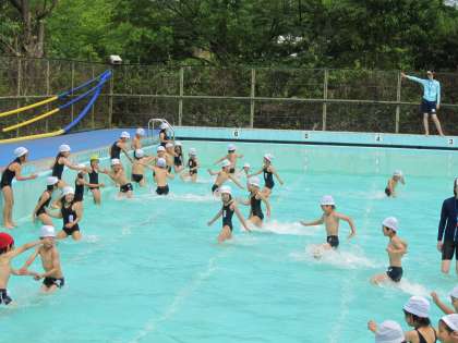 6月9日(水)に,2年生になって初めての水遊びをしました。水の中でワニさんになったり水の中を走ったり楽しく水遊びをしました。水温23度で気持ちよく入れました。