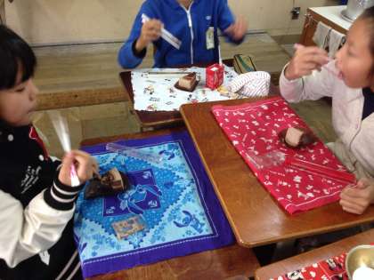 給食にチョコレートケーキが出ると知った子どもたちは大変喜んでいました。実際に食べている子どもたちの声を聞くと