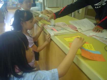 あじさい読書週間(6月8日〜14日)の間に,本を借りた子に図書委員がしおりをプレゼントしています。低学年の子を中心に多くの子がしおりをもらっています。中には「まだしおりをもらっていないよ。」といってくれる子もいて図書委員はうれしく思っています。