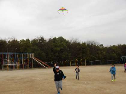 羽子板,こま,けん玉,凧揚げの中で子どもたちが一番興味を持ったのが凧揚げでした。高く揚げたいけど,どれくらいの糸の長さがベストなのか,いろいろやってみながら調整していました。羽子板はなかなか当たらず,苦戦していました。