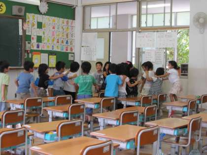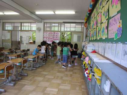 6月17日(木)に1年生の教室の前を通ると,とても元気よく「かもっつれっしゃしゅっしゅっしゅう♪♪♪・・・」と歌う声が聞こえてきました。1年1組では音楽の始めに,リズムに乗ってこの歌を歌っています。子ども達はとてもこの歌が好きです。