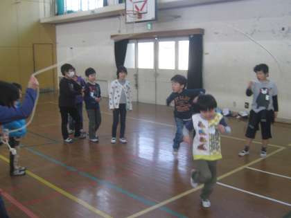 1年生は4年生と一緒に今日は体育館でキャンプファイヤー・レクリエーションと大縄跳びをしました。また、八の字跳びにも挑戦しました。