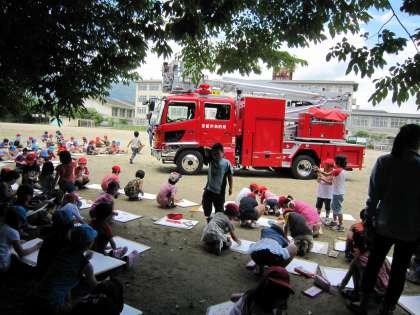 6月28日(月)西京消防署より消防車に来ていただき,1・2・3年生が写生をしました。「どうかいたらいいの?」「うまくかけたよ。」と言いながら消防車を描いていました。