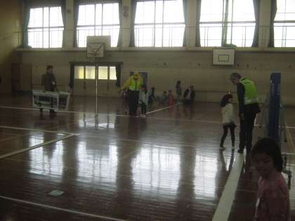 道路の歩き方について学習し、体育館につくられたミニ福西のまちを歩きました。