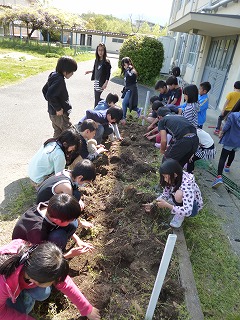 春休みの間に,4年生の花壇にいろいろな草花が育っていたので,みんなで力を合わせて草抜きをしました。