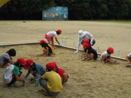 7月1日〈木〉1年生は図工の学習で,チョークや水,土を使って,自分の思いを表現しました。チョークでかいていた子は,「先生やってみて。めいろだよ。ここがゴール!」と話してくれました。