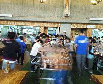 花脊山の家も3日目になり,旧八桝校から花脊山の家に移動しました。今日は,久しぶりの青空で天気もよく,川遊びを体験し,子どもたちはとっても満足したようです。おなかもすいて,山の家の食堂でバイキング方式の夕食を楽しみました。