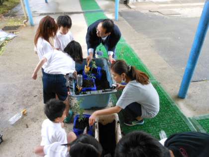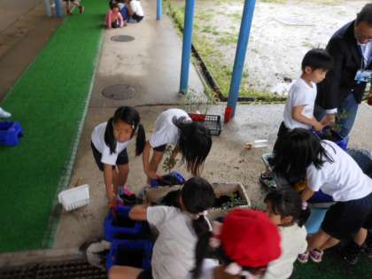 生活科「ぐんぐんそだて」では,ミニトマトを育てます。今日はあいにくの天気でしたが,苗も弱ってしまうため,プランターに植えました。これから毎日水やりをやり,大きく育てましょう。