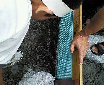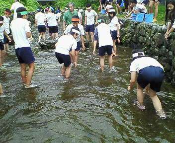 子どもたちは,イワナを目の前にしてつかむのに大奮闘しています。捕まえたイワナを一人1匹ずつ,自分でさばいて塩焼きにします。そして,野外バイキングの始まりです。