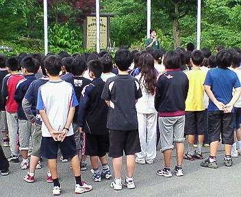 いよいよ長期宿泊花脊山の家も最終日になりました。天気もよくさわやかな自然の中で参加校5校合同の朝の集いを行いました。そして,各校から学校紹介をしました。その後,食堂で朝食をとりました。みんなしっかり食べ,元気です。