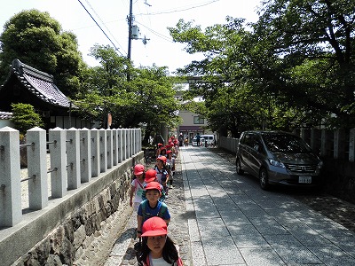 とってもいい天気の中、1年生は2・3年生のお兄さん・お姉さんと一緒に向日市にある向日神社・勝山公園へ行ってきました。