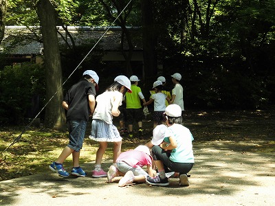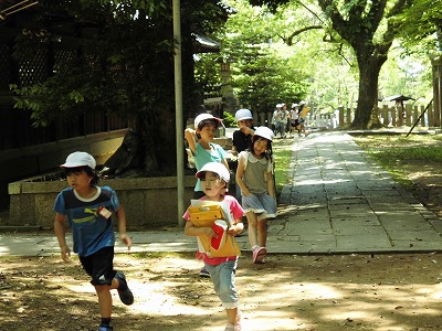 鎮守の森の中でお兄さん・お姉さんたちと一緒に協力し合って、楽しみました。「シャシャマンボって、どこにあるのー?」「あ、ここにあったー!」といった声が森のあちらこちらから聴こえてきて、みんなとても楽しく取り組んでいる様子でした。