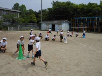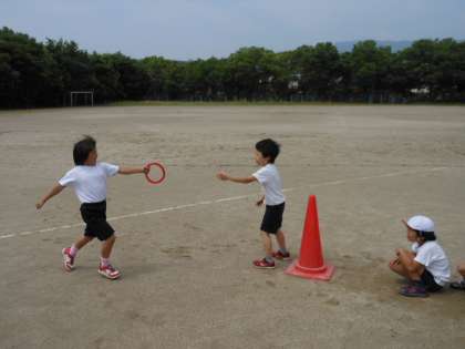 夜の雨で少し足元がゆるかったですが,みんな一生懸命走りました。走る順番やバトンの渡し方をチームで相談して1位をめざしてがんばっています。