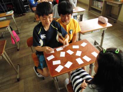 国語は,漢字の成り立ちを学びました。象形文字,指示文字,会意文字,形声文字を勉強した後,漢字カードを使って神経衰弱をしました。