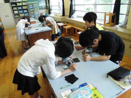 理科の「植物の発芽」の学習でヨウ素液を使いました。ヨウ素液はデンプン反応を調べるための薬品です。インゲンマメの種子には養分がふくまれているのかどうかを調べました。また,インゲンマメの種子の構造をネイチャースコープを使って,観察しました。