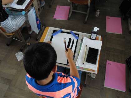 書写の時間に毛筆の使い方を練習しました。力の入れ方によって,いろいろな太さの線が書き分けられることが分かりました。
