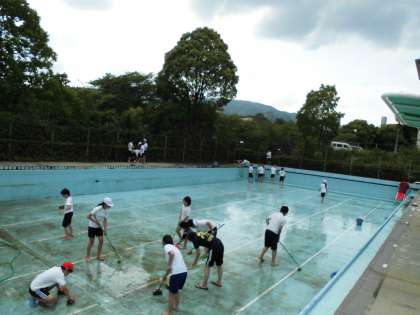 はじめに5年生が汚れを取り除き,次に6年生が壁や底を磨いてプールを美しくしました。5年生6年生のがんばりで来週からプールでの学習を始められます!