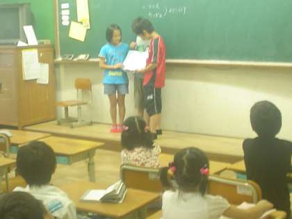 図書委員会では,朝の時間に教室に行って読み聞かせをしています。写真は7月14日〈水〉の読み聞かせの様子です。聞いている子ども達も身を乗り出して聞いています。