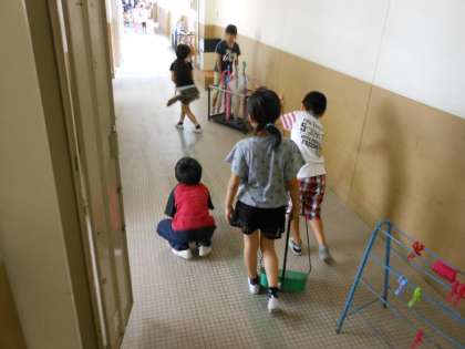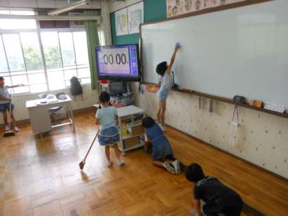 グループに分かれて清掃活動をしています。そうじのリーダーがあいさつ,めあてを言ったあとにそうじを始めています。4月からくらべると上手になってきただけでなく,活動に熱心さが加わってきました。これからも頑張って清掃していきましょう。
