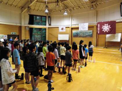 午前7時から、下鳥羽小学校、向島小学校、福西小学校の三校合同の朝の集いがありました。校歌を順番に歌った後、それぞれの学校紹介をしました。