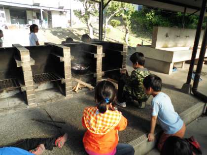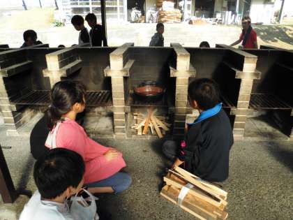二日目の午後のメインイベント、野外炊事に挑戦です。普段は、電気やガスで簡単に調理できますが、今日は自分たちでまきを使って火をたきます。