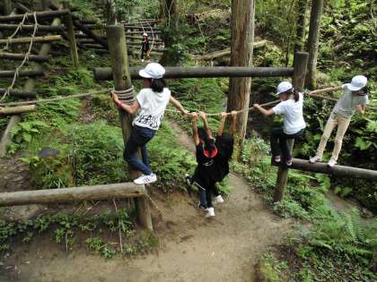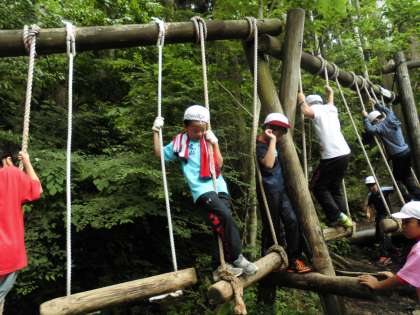 午後の一つ目の大きな活動は、「冒険の森」に挑戦することです。子どもたちの冒険心をかりたてるコースになっていて、スタートしたらほとんどが一方通行で後戻りすることができません。