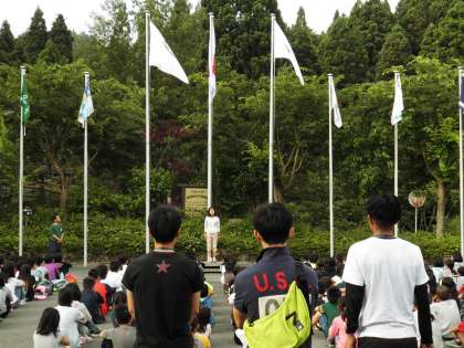二日目の朝は、5校合同の「朝のつどい」で始まりました。はじめは、花背山の家の所員さんから話を聞きました。続いて、学校紹介です。福西小学校は、代表の児童一人が、堂々とした態度で発表することができました。