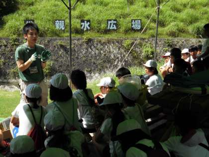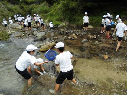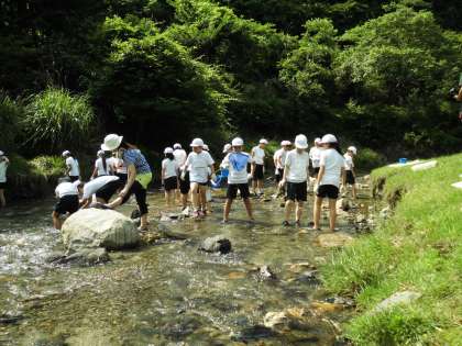 午後の活動のメインは、親水広場での活動でした。現地へ到着すると所員さんから活動の注意を聞き、その後、班ごとに観察道具を使って、川に生息しているいろいろな生き物を探して観察しました。