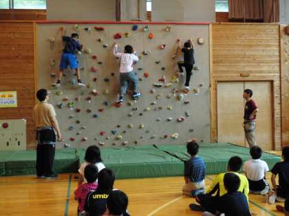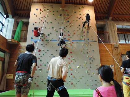 最終日の活動になりました。プレイホールに設置してある設備を利用してのクライミング&ボルダリングです。初めて経験する人も多く、初めは恐る恐るという感じもありましたが、全員が担任のサポートのもとに挑戦しました。