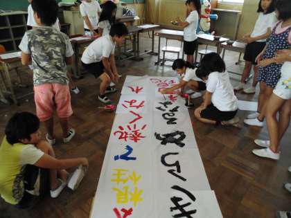 今月は運動会のスローガンについて話し合い,3年生以上の代表委員と計画委員会でスローガンの垂れ幕をつくりました。