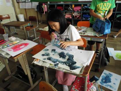 図工「物語から広がる世界」でお話を絵にする活動に挑戦しています。そこで,まずは4月の心のもようを思い出し,その技法などを使っていろんなもようを塗りました。つぎに泡を使い,ストローで泡もようにチャレンジしました。みんな楽しそうでした。