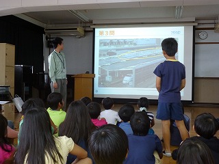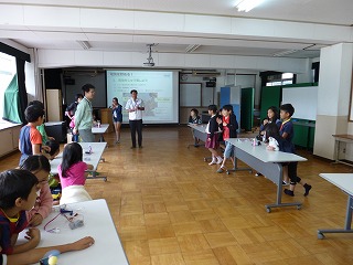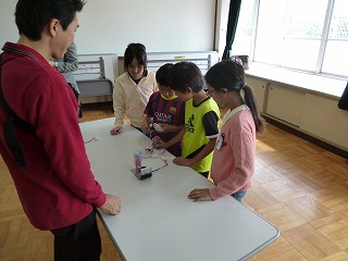 3校時には部屋の中で,手回し発電機を使って電気を作ったり,作った電気をためたりすることを体験しました。