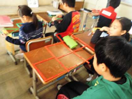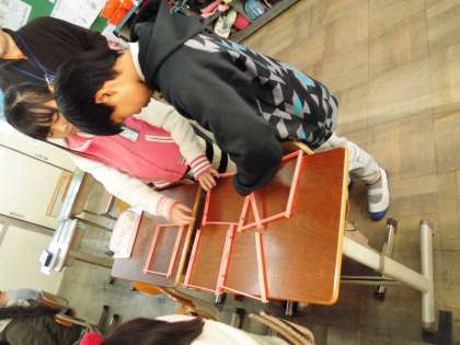 算数の学習「順々に調べて」で少ない場合から順番に調べて,表に整理していくという学習をしています。写真の様子は,ひごを使い四角で段を作っていく様子です。まず,表に整理するのではなく,少ない場合を絵や図に表し,数字に表していくことで答えの糸口を探しています。