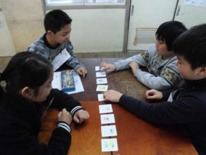 外国語の学習「I study Japanese〜夢の時間割をつくろう〜」の学習が始まりました。まずは,教科の英語表現を学びました。書写,社会,家庭科は特に覚えにくいようでなかなか頭に残らないようでした。そこで行ったのが「テリトリーゲーム」。教科カードを1列に並べ,順番に行っていき相手の陣地に入り込んでいくというゲームです。子どもたちの遊びに例えて言えば「ドンじゃんけん」です。