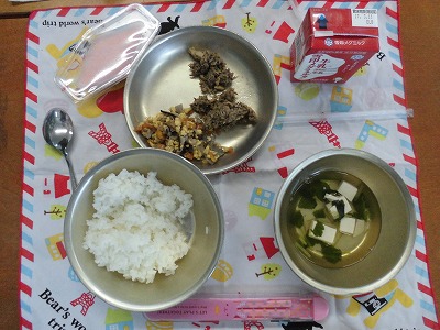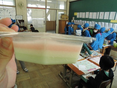 そんな日だからこそ,給食にはお雛様にお供えする菱餅の形・色をした三色ゼリーが登場しました。1年生にとって,初めて食べるデザートです。