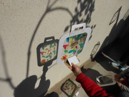 図工科で「光のプレゼント」を作りました。天気がとても良かったため,早く作り上げた子から外へ出て遊んでみました。友だちと重ねたり,映す場所を変えたりするとまるで違う作品のように見えます。今度はみんなで遊んでみたいと思います。