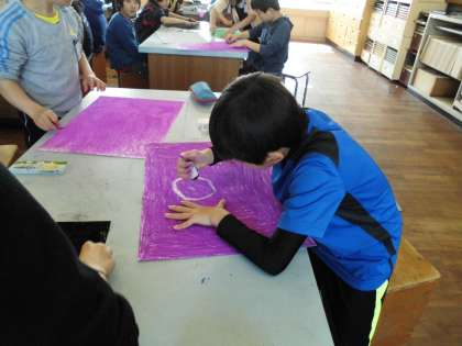 図工では、画用紙をコンテで塗りつけた後、