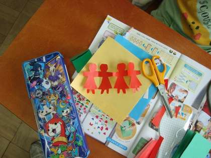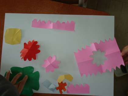 折り紙を折ったり重ねたりして,いろいろな形にはさみで切って飾りをつくりました。