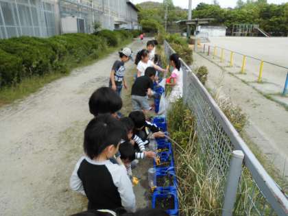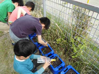 生活科の学習で,ミニトマトを植えました。小さなミニトマトの苗を鉢に植えたとき、子どもたちは大喜びで,早速水をやっていました。これから学習で継続的に成長を観察を続けていこうと思います。