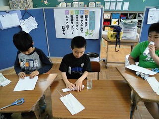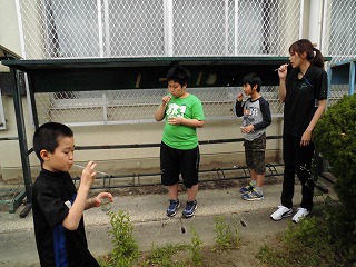 「シャボン玉の液って自分たちで作れるんだ。去年も作ったけど,作り方を忘れてしまったな。」と思い出して今年もシャボン玉の液を作りました。洗剤や洗たくのりの量を考えて作りました。「シャボン玉できるかな?」とドキドキしながら吹きました。