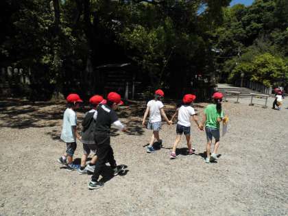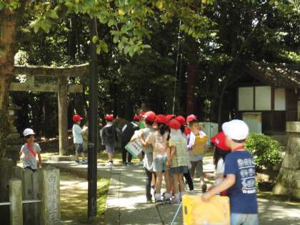 向日神社では,学校探検のときのグループで,境内の複数ポイントを探す「フォトラリー」をしました。2年生が1年生の手をつないで,目的とする場所に向かう姿は,とても立派でした。