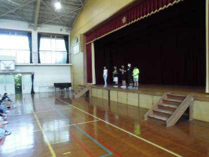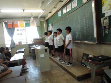委員会では,児童朝会で各委員長が成果と課題を伝える様子です。